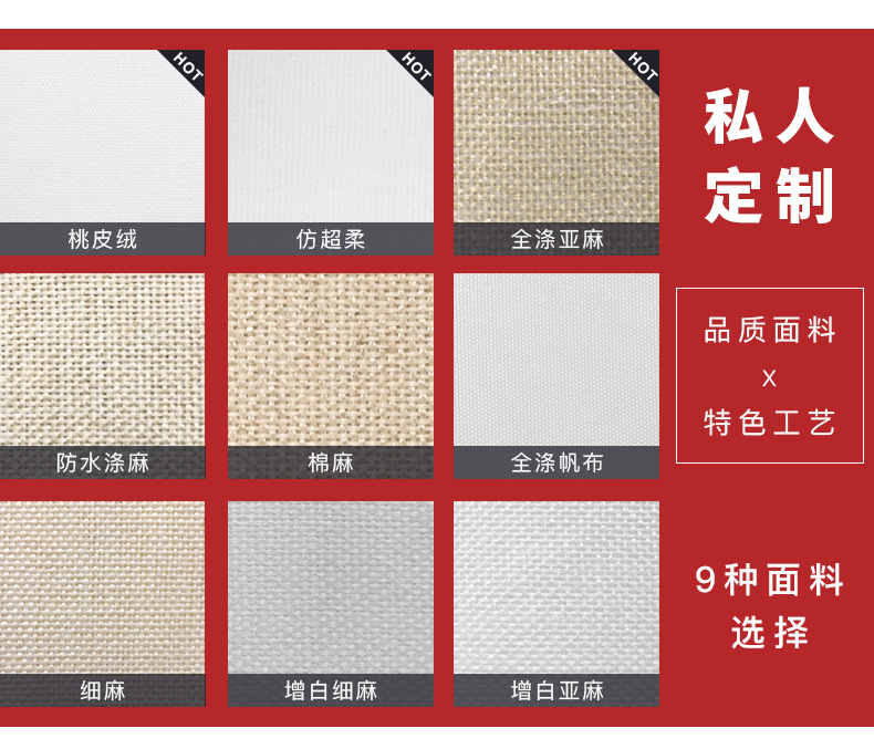 4、另有亞麻、超柔、棉麻、春亞紡等多種面料可供選擇,其他材質價格不同詳細請咨詢客服。